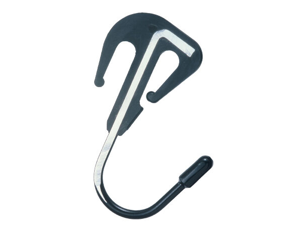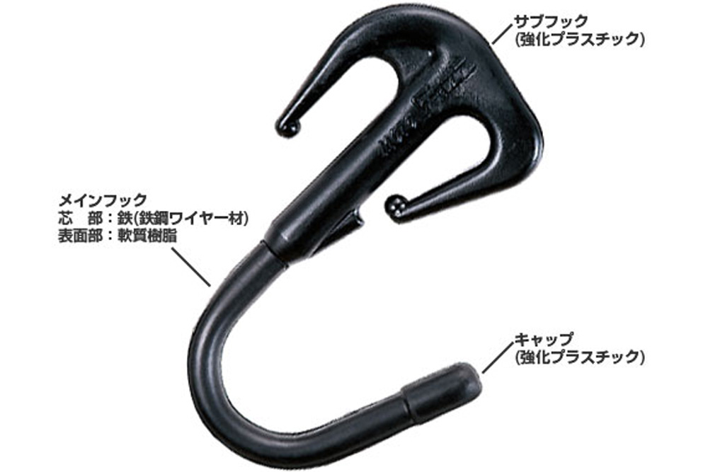 ■メインフックの芯部は、鉄(硬鋼ワイヤー材)フックにより、長時間使用しても、樹脂フックと比べ変型や切れの心配が低減されるので、耐久性、信頼性も向上しました。メインフックの表面部は、キズを防止する軟質樹脂チューブを採用。