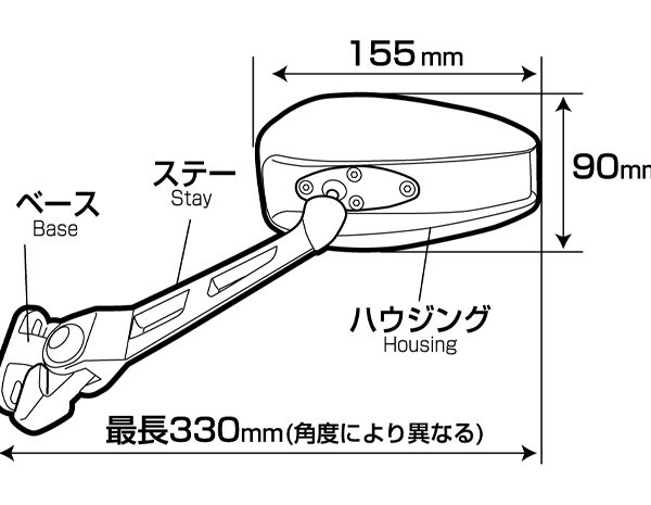 部品構成 | ・ミラー本体(左右共通)×1 ・スペーサー×1 ・パッキンA×1 ・パッキンB×1 ・M6×40mmボルト×2 ・M6×30mmボルト×2 ・M6×20mmボルト×2 ・M6×15mmボルト×2 ・M6ワッシャー×2 ・M6ナット×2 ・8mmボルトキャップ×1 ・6mm六角レンチ×1 ・4mm六角レンチ×1 ・2.5mm六角レンチ×1 |