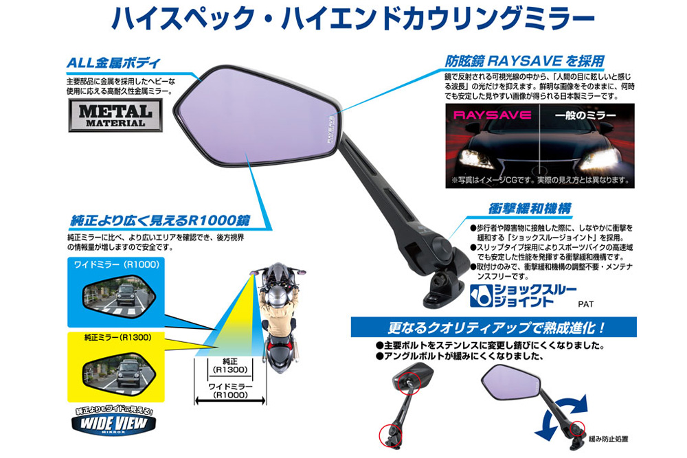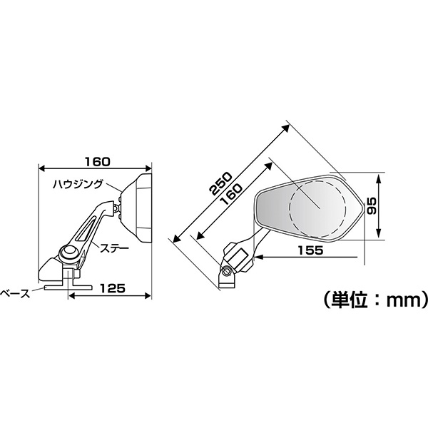 部品構成 | ・ミラー本体(左右共通)×1 ・スペーサー×1 ・パッキン×2 ・M6*40mmボルト×2 ・M6*30mmボルト×2 ・M6*20mmボルト×2 ・M6*15mmボルト×2 ・M6ワッシャー×2 ・M6ナット×2 |