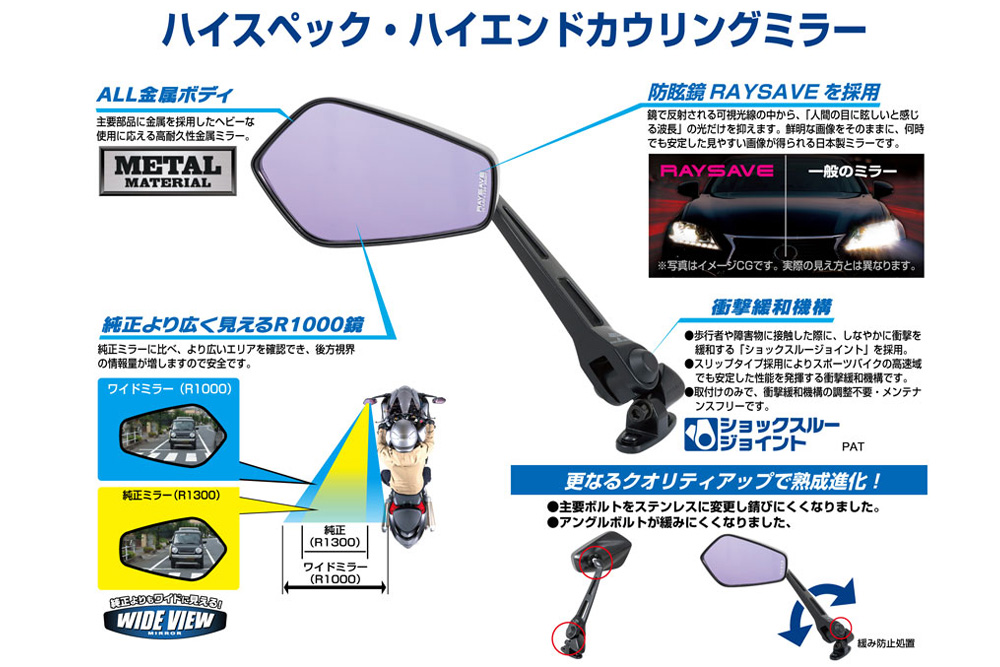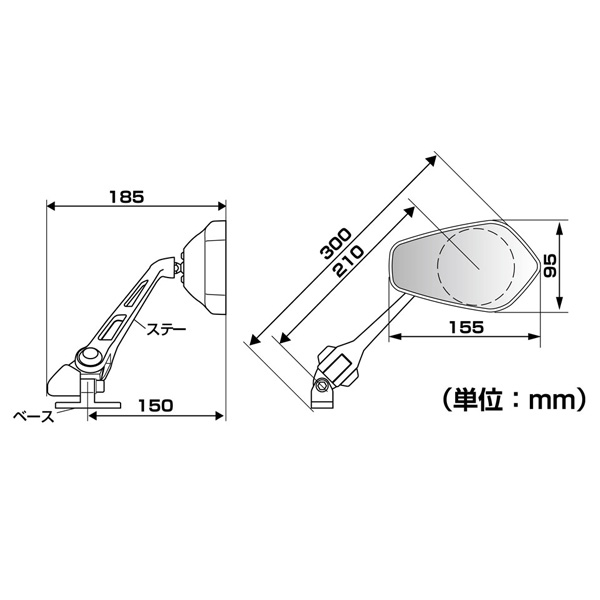部品構成 ・ミラー本体(左右共通)×1 ・スペーサー×1 ・パッキン×2 ・M6*40mmボルト×2 ・M6*30mmボルト×2 ・M6*20mmボルト×2 ・M6*15mmボルト×2 ・M6ワッシャー×2 ・M6ナット×2