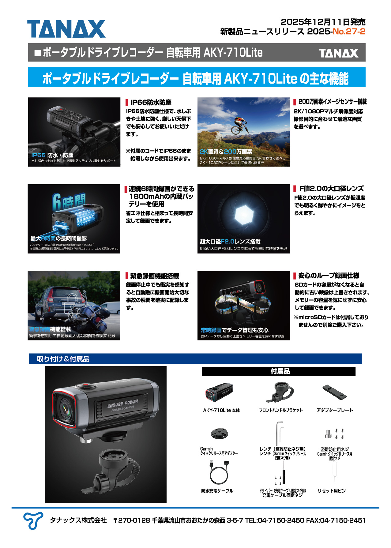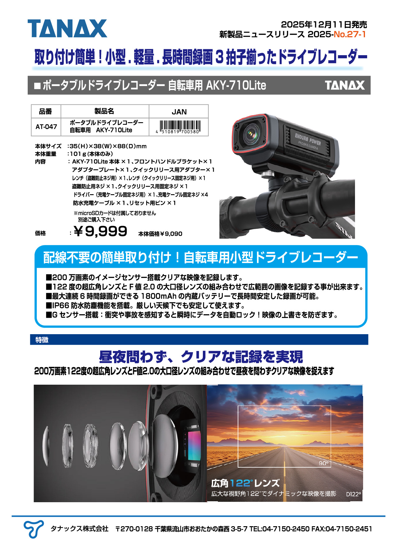 2025年12月11日に配線不要の簡単取り付け!自転車用小型ドライブレコーダー AT-047 ポータブルドライブレコーダー 自転車用 AKY-710Liteを発売