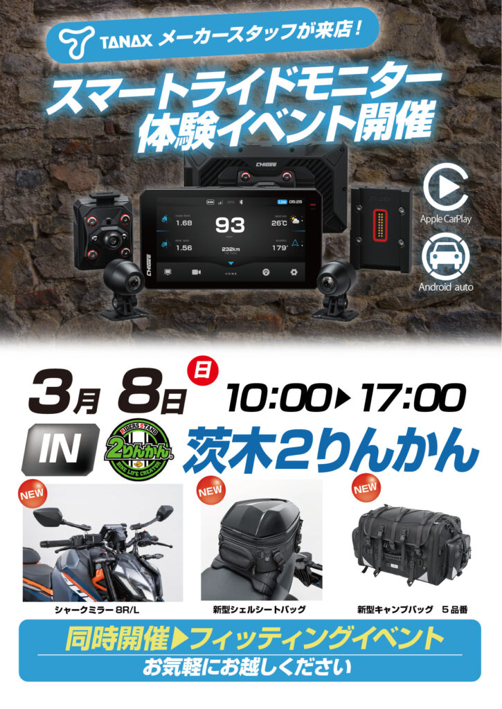 当日は、話題のスマートライドモニターと新製品のバッグ等の展示を行う予定です。