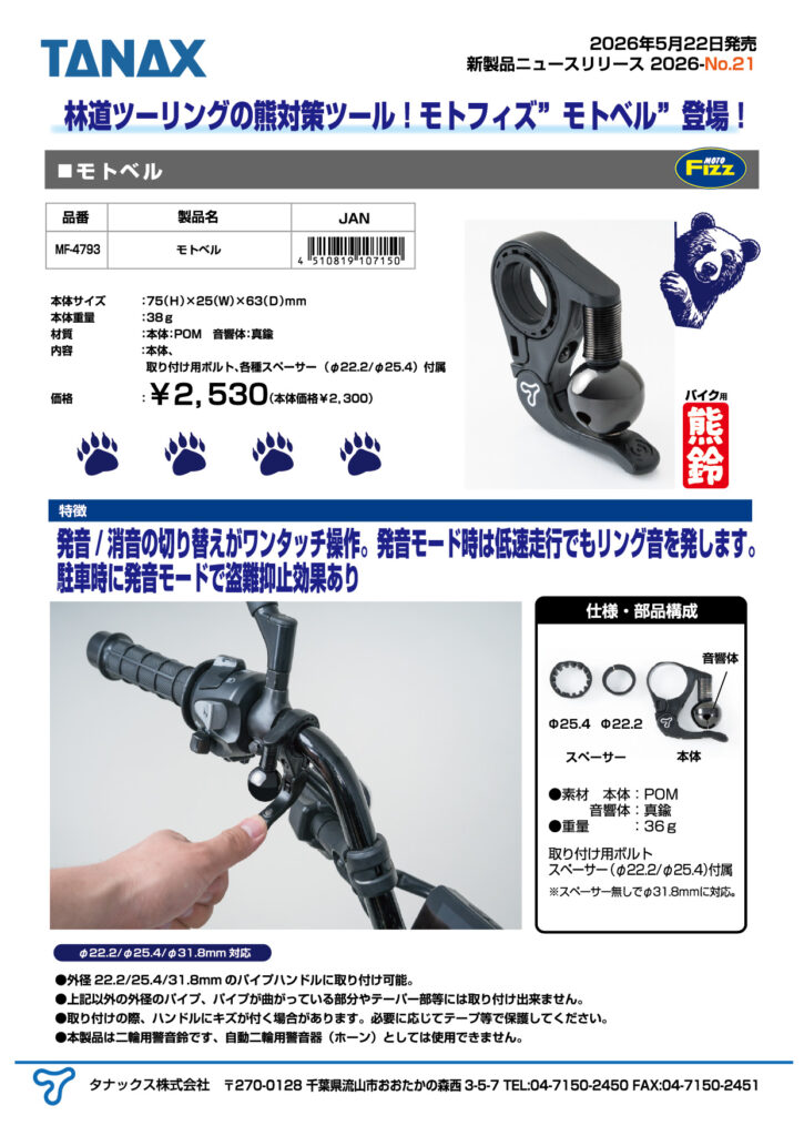 林道ツーリングの熊対策ツール!モトフィズ”モトベル”登場!発音/消音の切り替えがワンタッチ操作。発音モード時は低速走行でもリング音を発します。駐車時に発音モードで盗難抑止効果あり