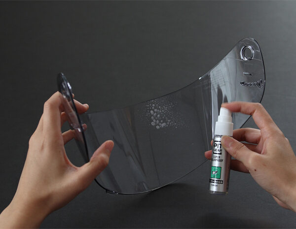 ②シールドに直接スプレーし、乾いた布等で拭きのばしてください。