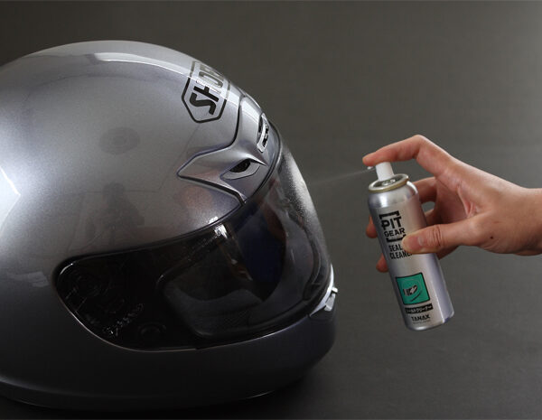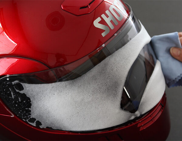②ヘルメットシールドに直接スプレーし、柔らかい布等でムラなく拭きのばしながら拭き上げてください。