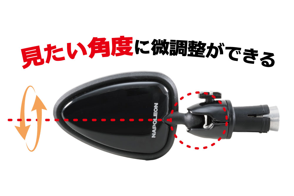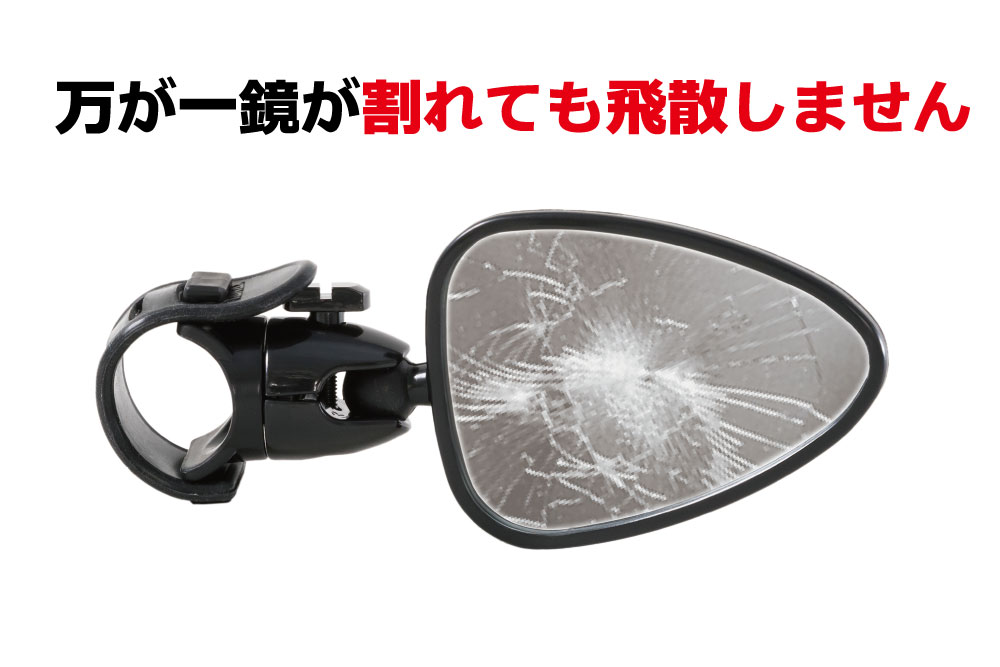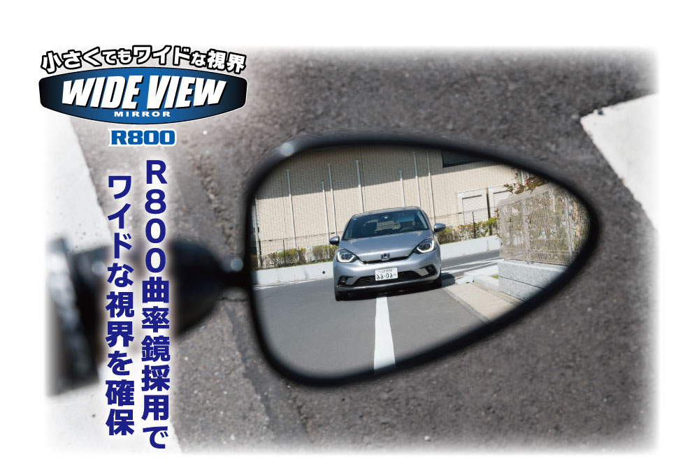 オートバイ用ミラーでも使用している高品質ミラーを使用し更にR800曲率鏡採用で歪みが少ないクリアーかつワイドな視界を確保
