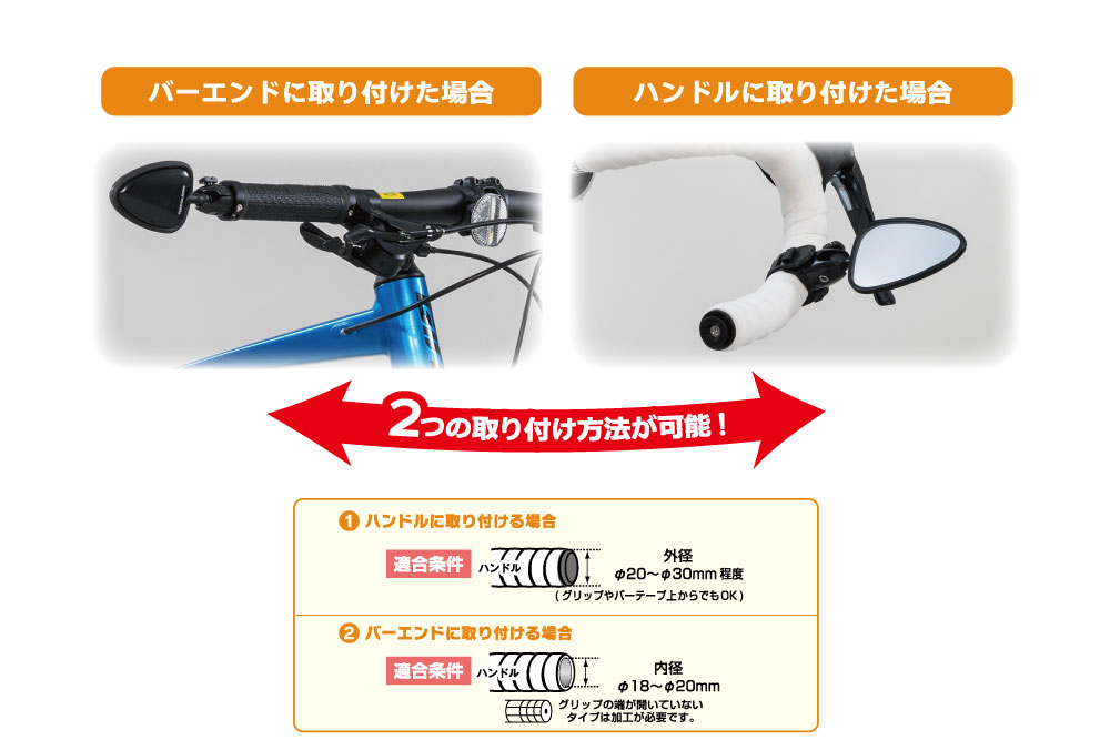 ハンドル/バーエンドの2種類の取り付け方が可能